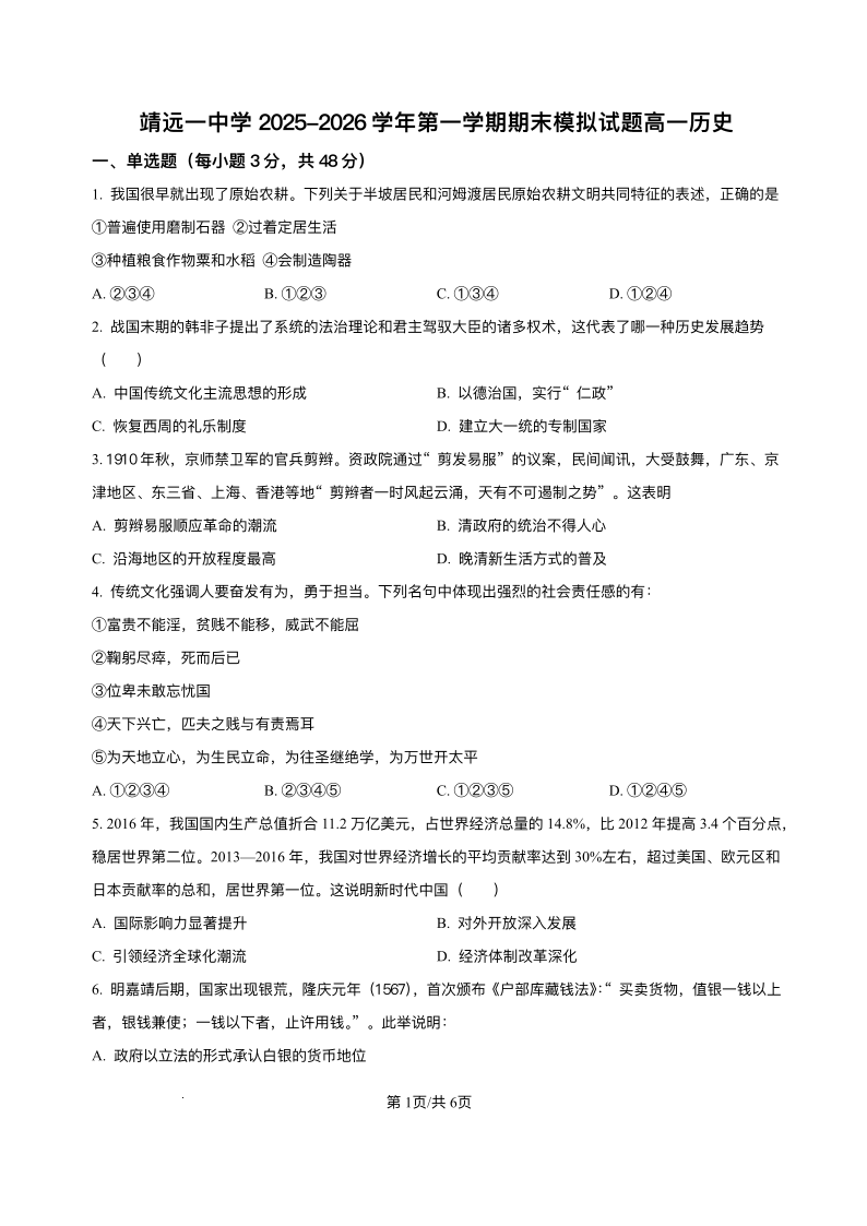 高一历史+答案--甘肃省白银市靖远县第一中学2025-2026学年高一上学期12月月考
