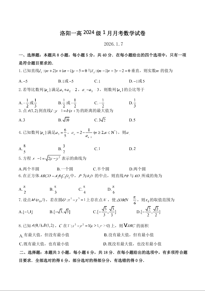 高二数学+答案--河南省洛阳市第一高级中学2025-2026学年高二上学期1月月考