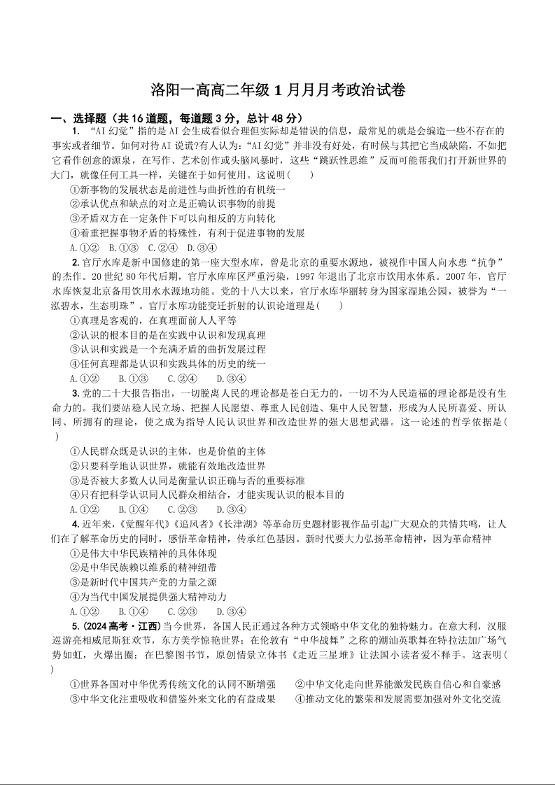 高二政治+答案--河南省洛阳市第一高级中学2025-2026学年高二上学期1月月考