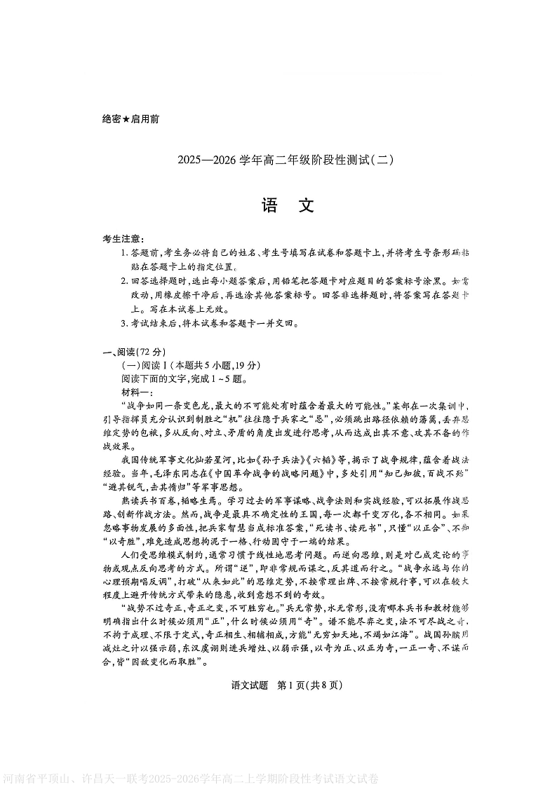 高二语文--河南省豫北名校2025-2026学年高二上学期阶段性测试(二)