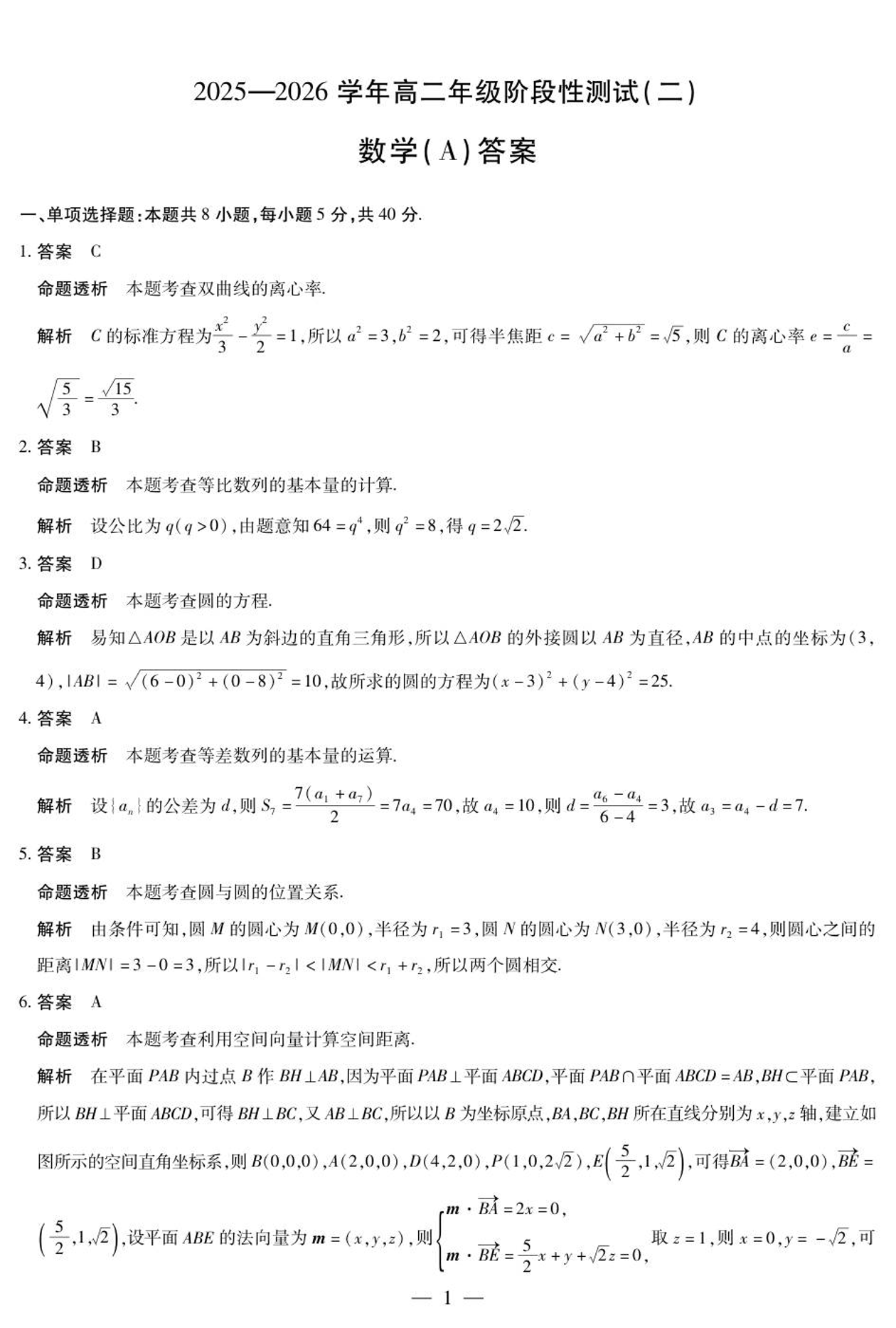 高二数学答案--河南省豫北名校2025-2026学年高二上学期阶段性测试(二)