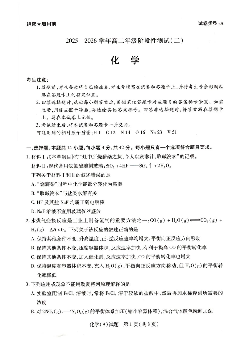 高二化学+答案--河南省豫北名校2025-2026学年高二上学期阶段性测试(二)