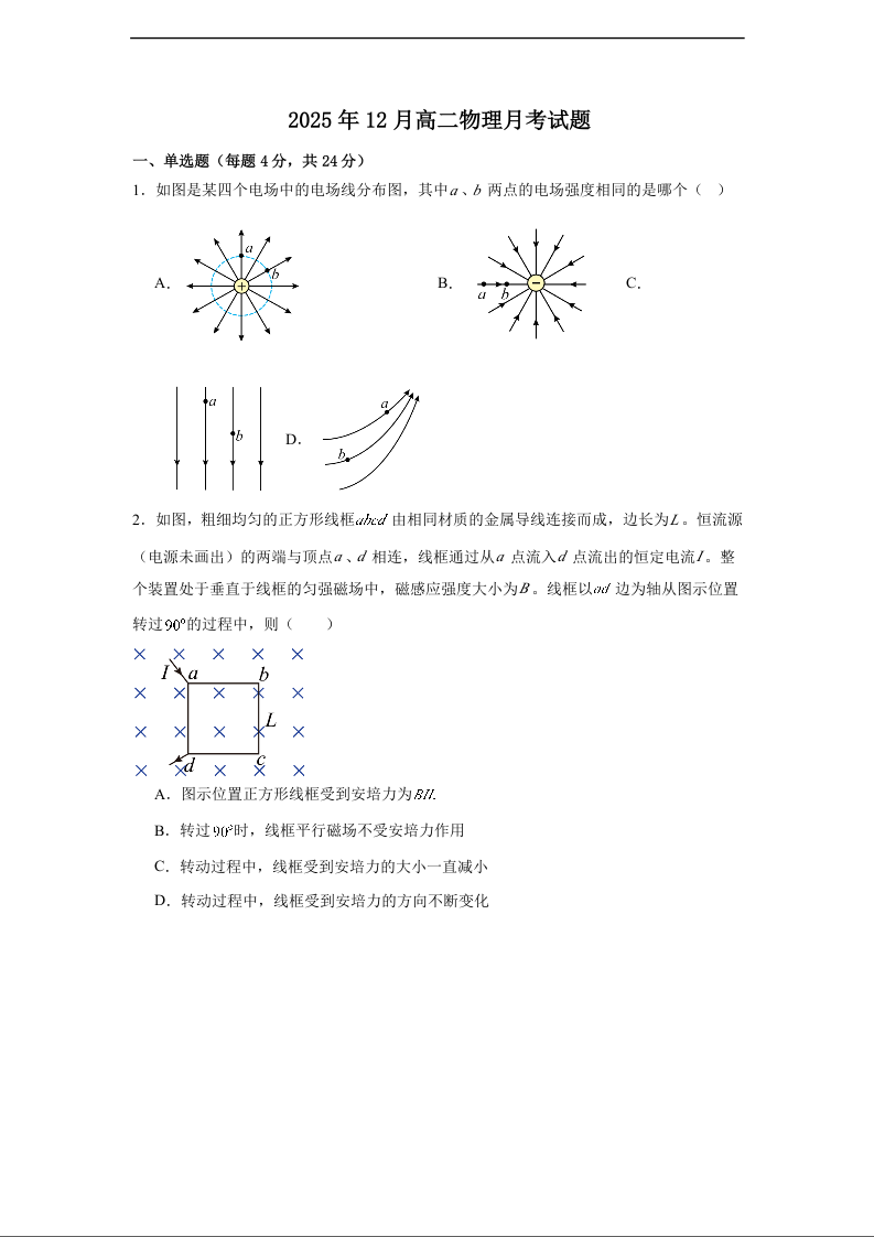 高二物理+答案--湖南省岳阳市汨罗市第二中学2025-2026学年高二上学期12月月考