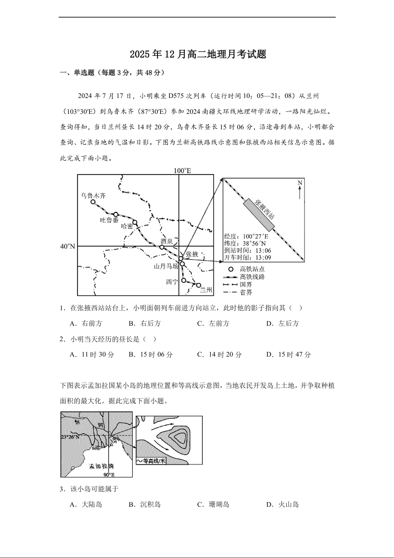 高二地理+答案--湖南省岳阳市汨罗市第二中学2025-2026学年高二上学期12月月考