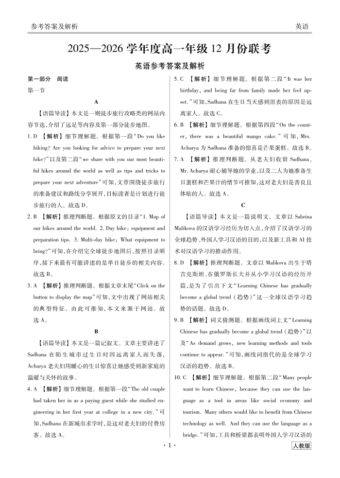 高一英语答案(人教版)--广东省衡水金卷2025—2026学年度高一年级12月份联考