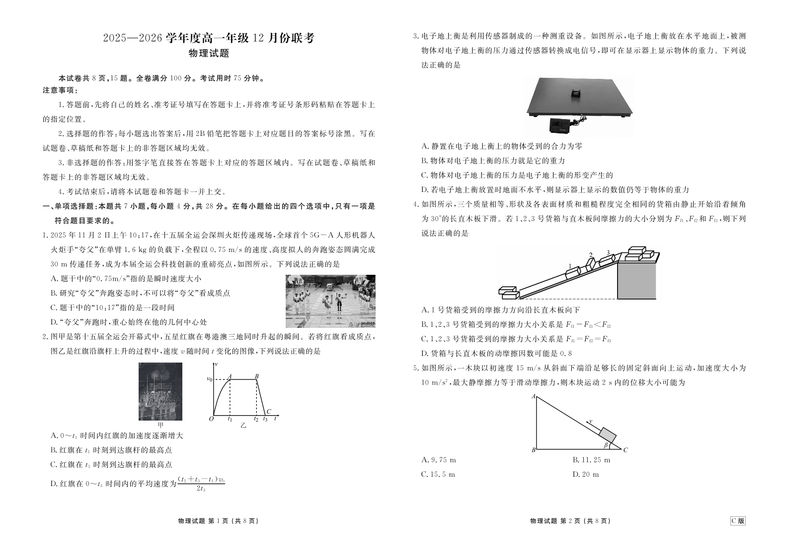 高一物理C版--广东省衡水金卷2025—2026学年度高一年级12月份联考