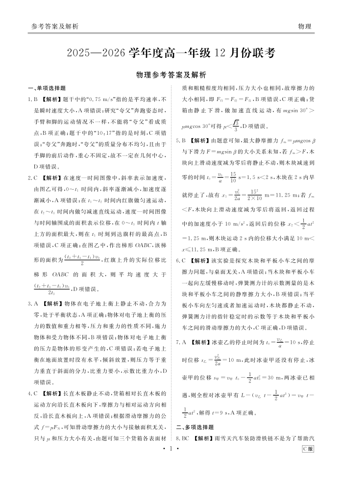高一物理答案C版--广东省衡水金卷2025—2026学年度高一年级12月份联考