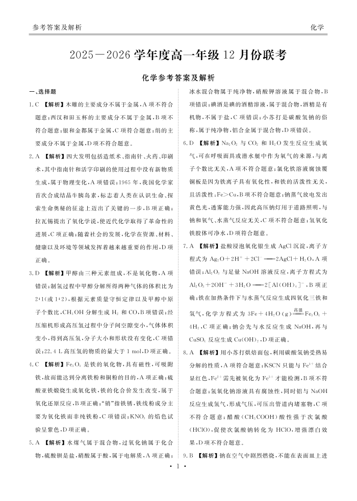 高一化学答案--广东省衡水金卷2025—2026学年度高一年级12月份联考