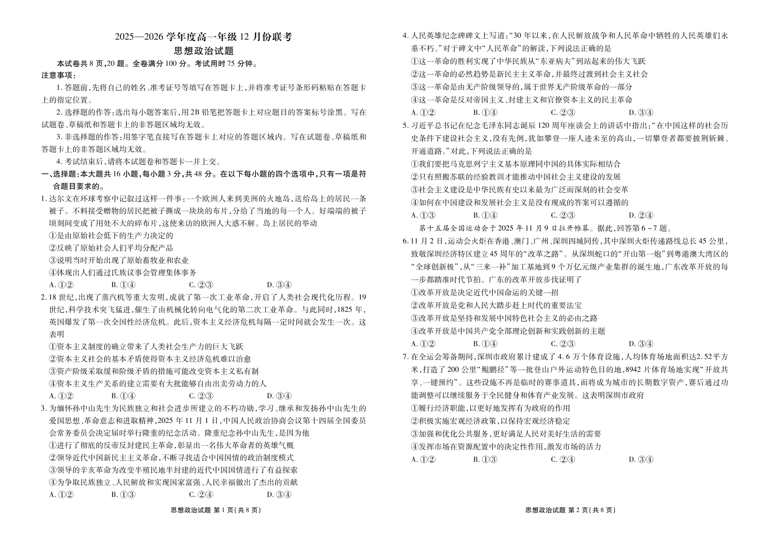 高一政治--广东省衡水金卷2025—2026学年度高一年级12月份联考