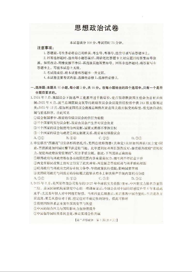高二政治--辽宁省抚顺市六校协作体2025-2026学年高二上学期期末联考