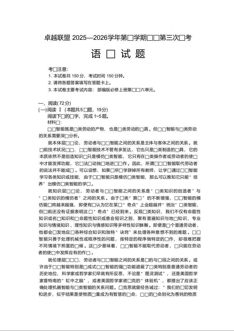 高一语文+答案--河北省邢台市卓越联盟2025-2026学年高一上学期1月月考