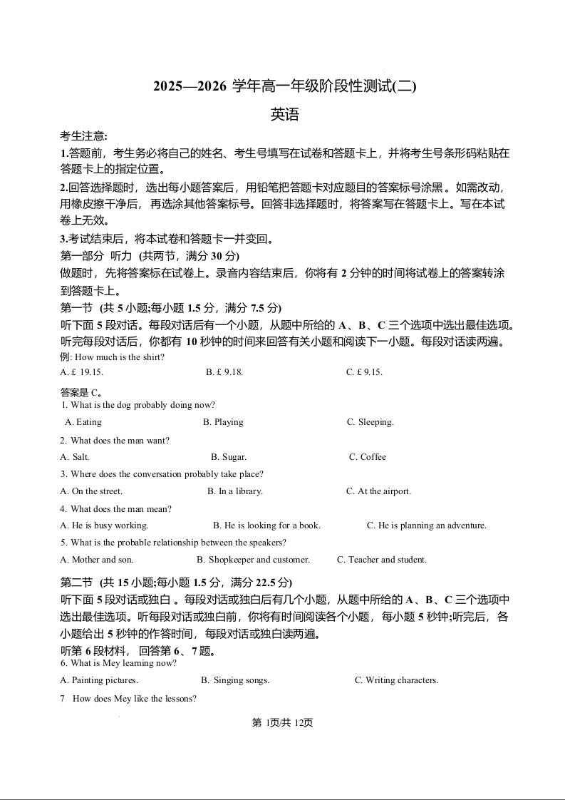 高一英语+答案--河南省豫北名校2025-2026学年高一上学期阶段性测试(二)