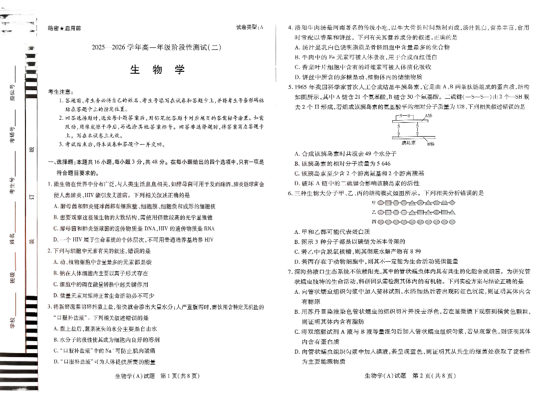 高一生物--河南省豫北名校2025-2026学年高一上学期阶段性测试(二)
