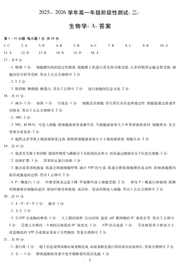 高一生物答案--河南省豫北名校2025-2026学年高一上学期阶段性测试(二)
