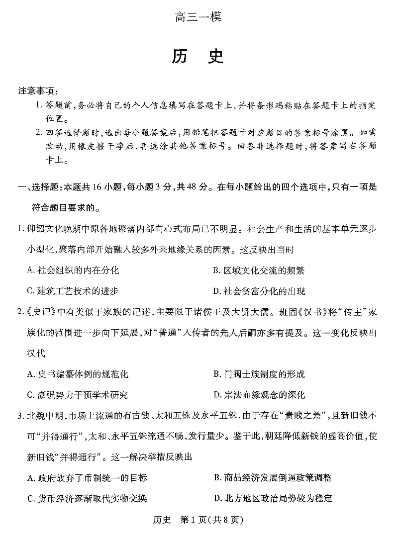 高三历史--河南新乡鹤壁安阳焦作2026届高三一模