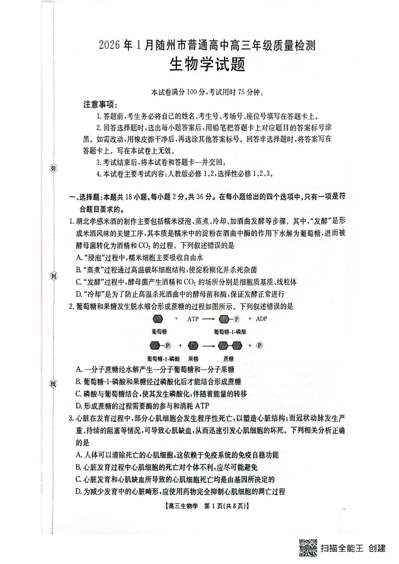 高三生物--湖北省随州市2026届高三上学期1月期末质量检测