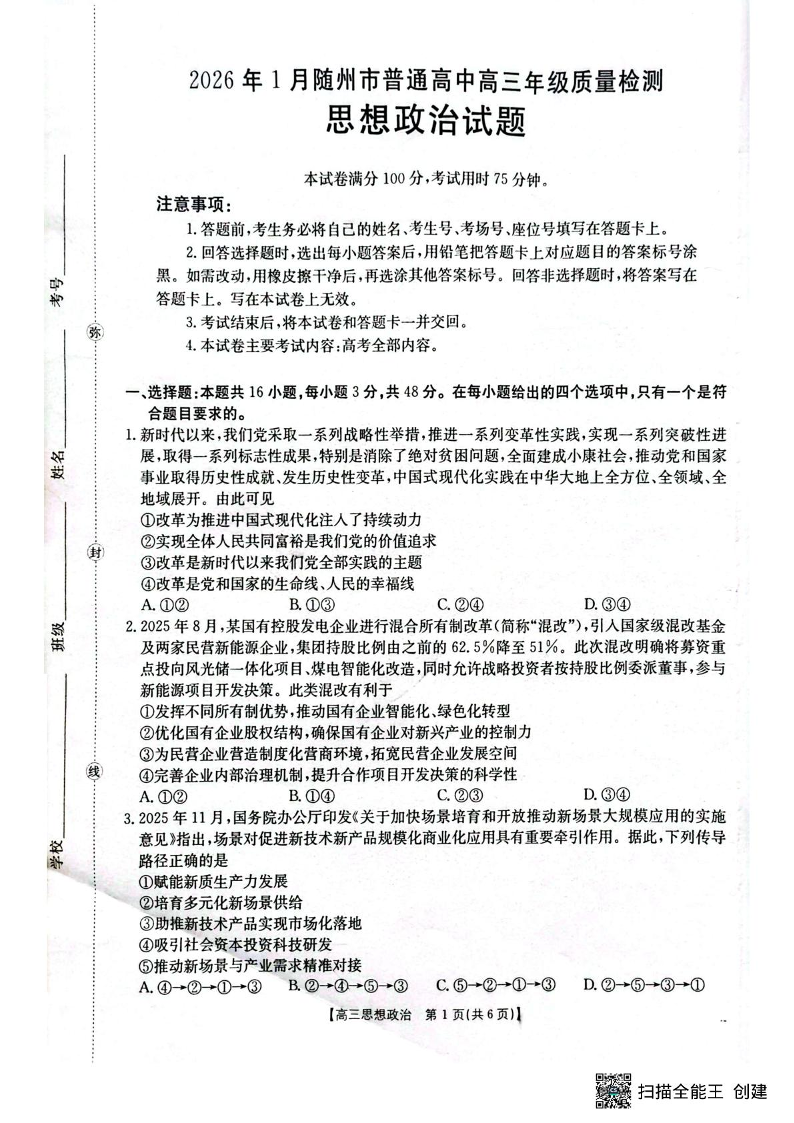 高三政治--湖北省随州市2026届高三上学期1月期末质量检测