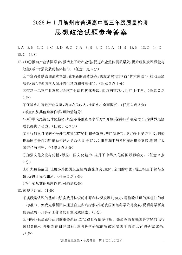 高三政治答案--湖北省随州市2026届高三上学期1月期末质量检测