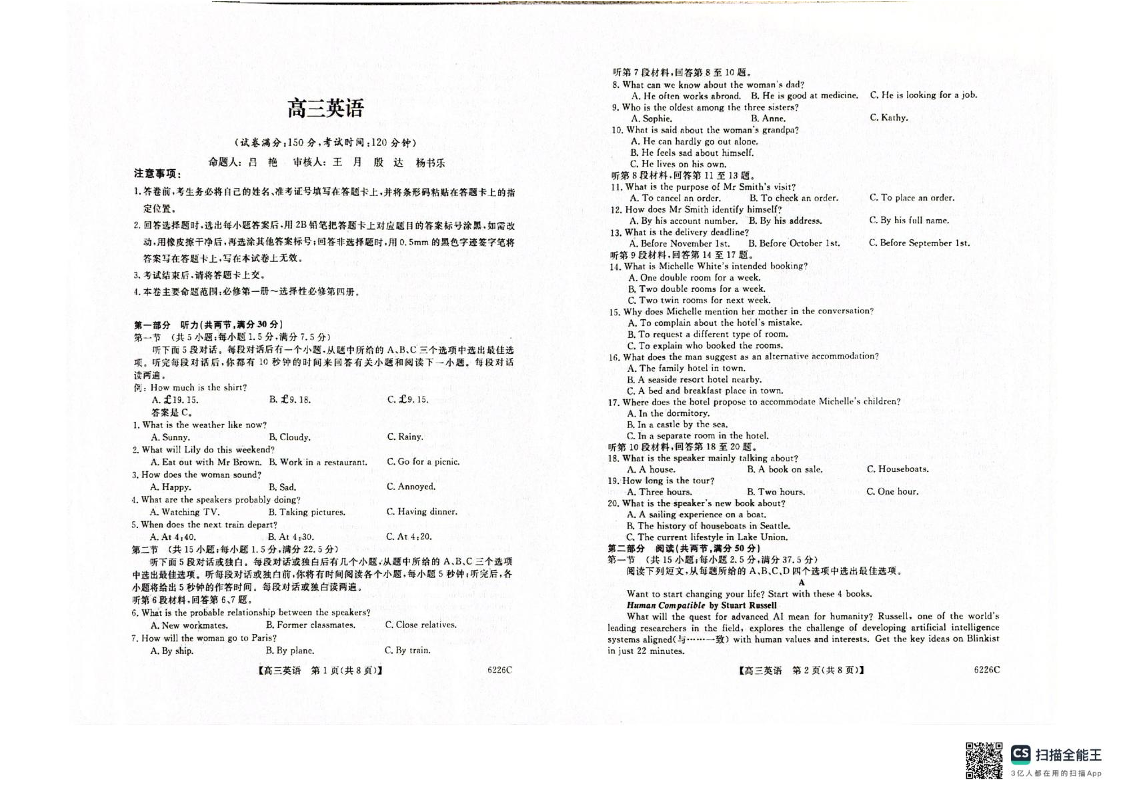 高三英语--吉林省白山市2026届高三上学期一模考试