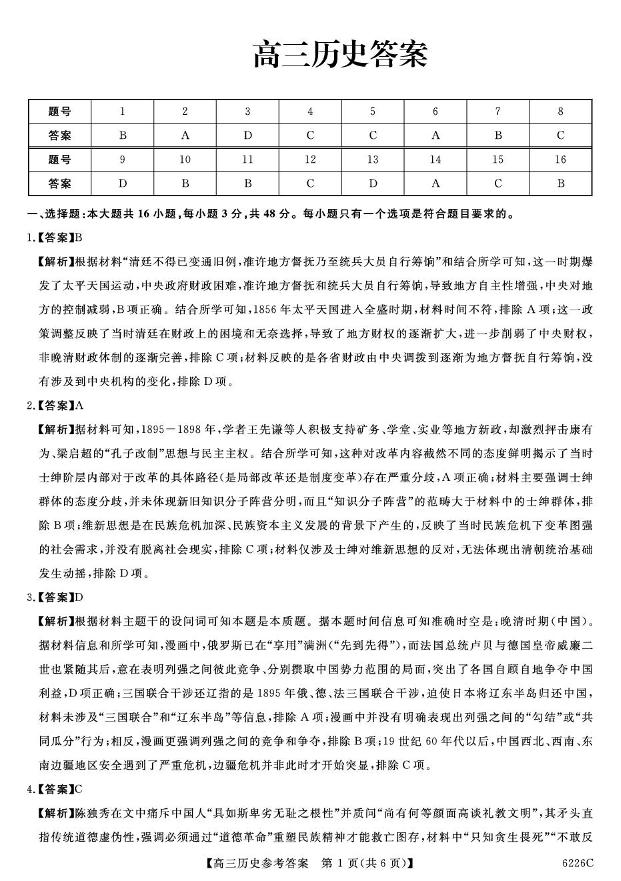 高三历史答案--吉林省白山市2026届高三上学期一模考试
