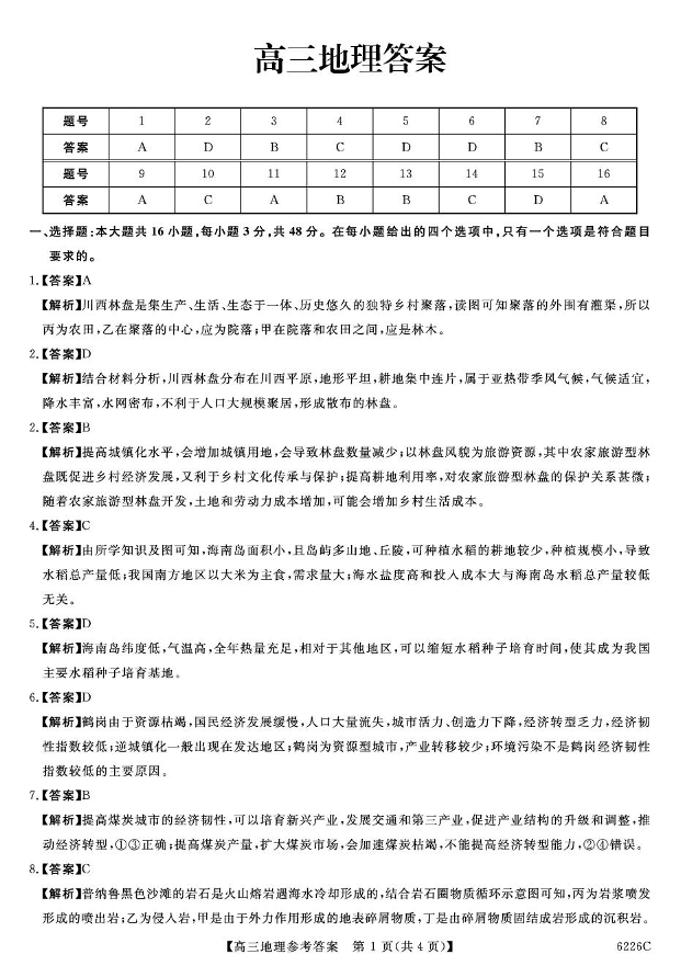 高三地理答案--吉林省白山市2026届高三上学期一模考试