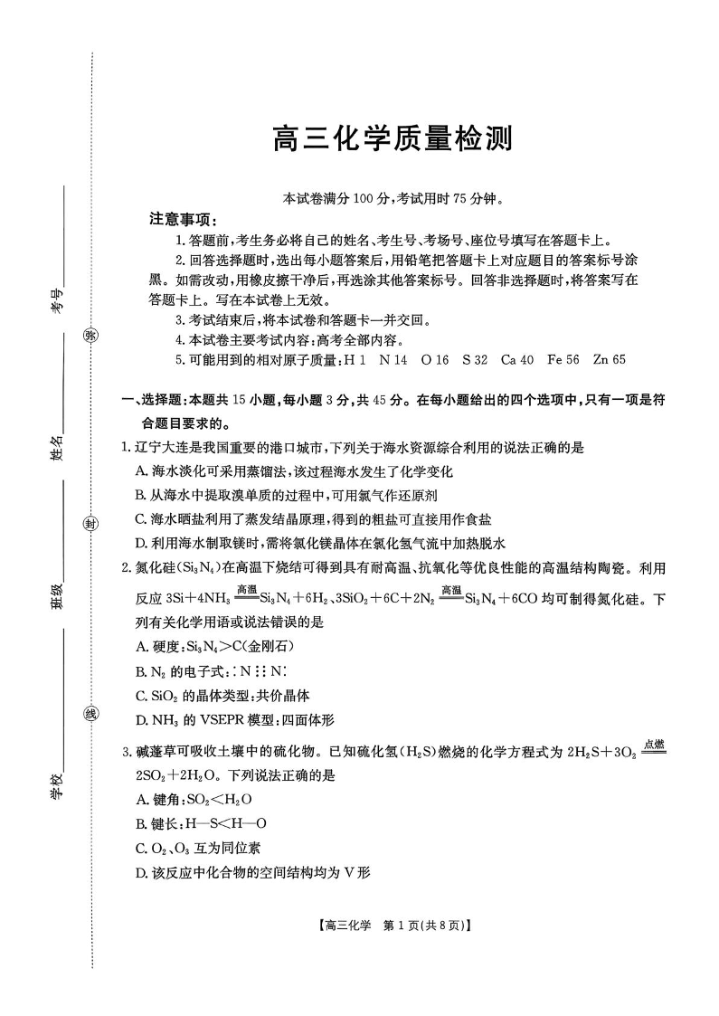 高三化学--辽宁省辽阳市2026届高三上学期1月期末质量检测