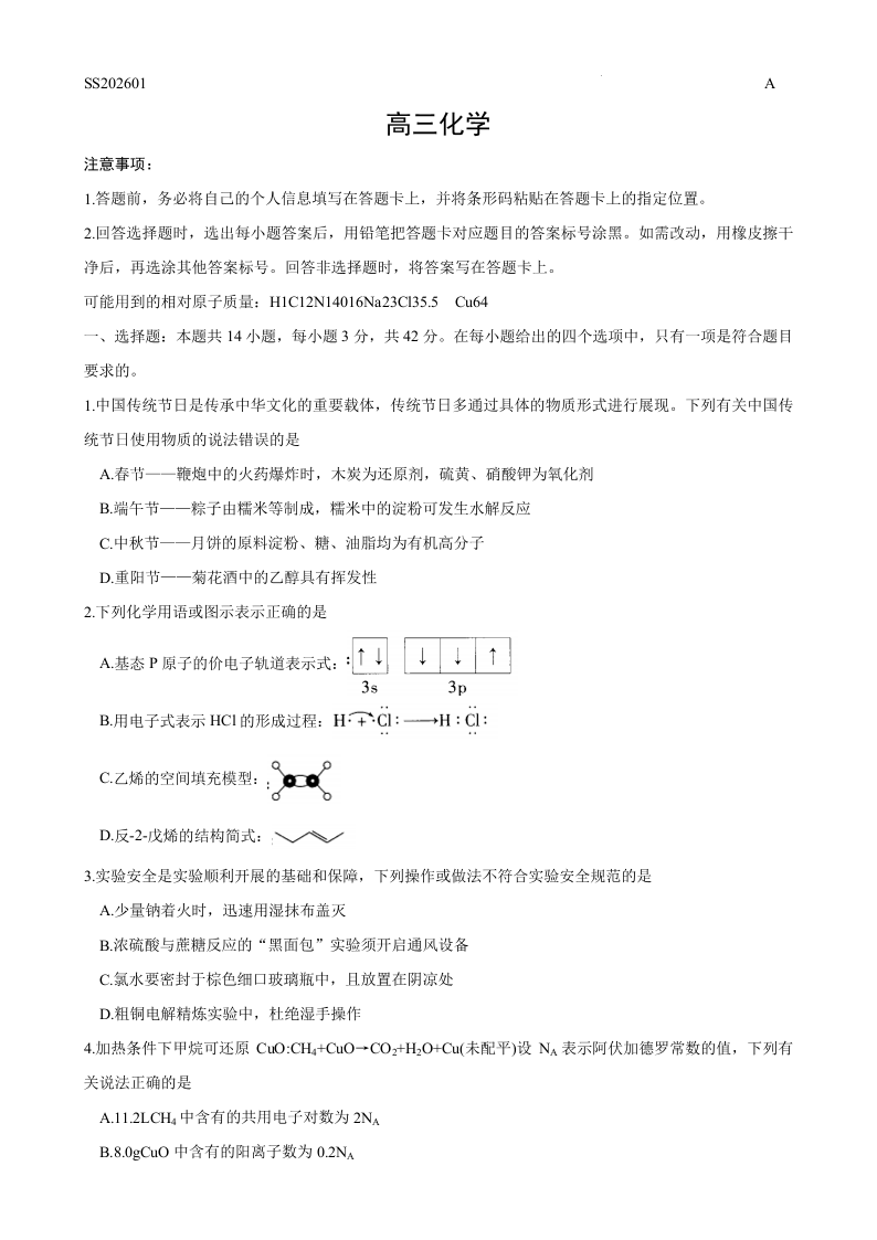 高三化学--陕西山西宁夏青海2026届高三学期1月四省联考
