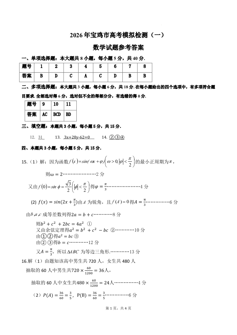 高三数学答案--陕西省宝鸡市2026年高三高考模拟检测试题(一)(宝鸡一模)