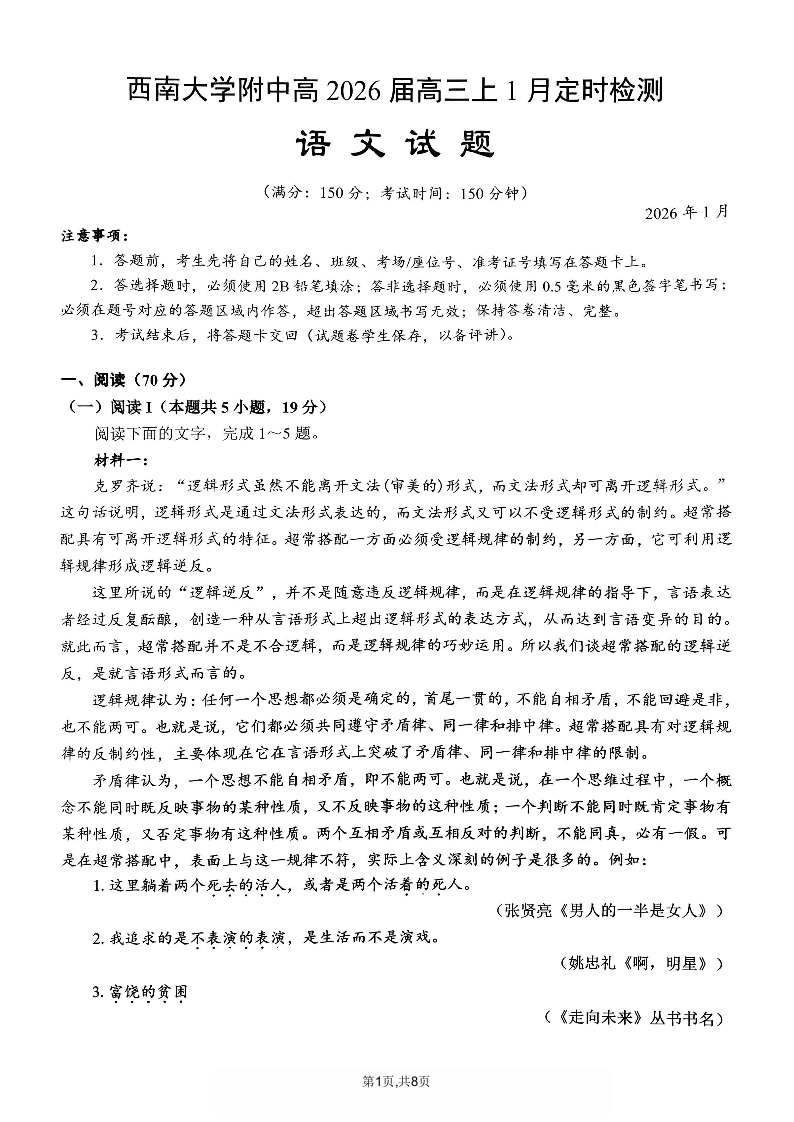 高三语文--重庆市西南大学附属中学2026届高三1月定时检测