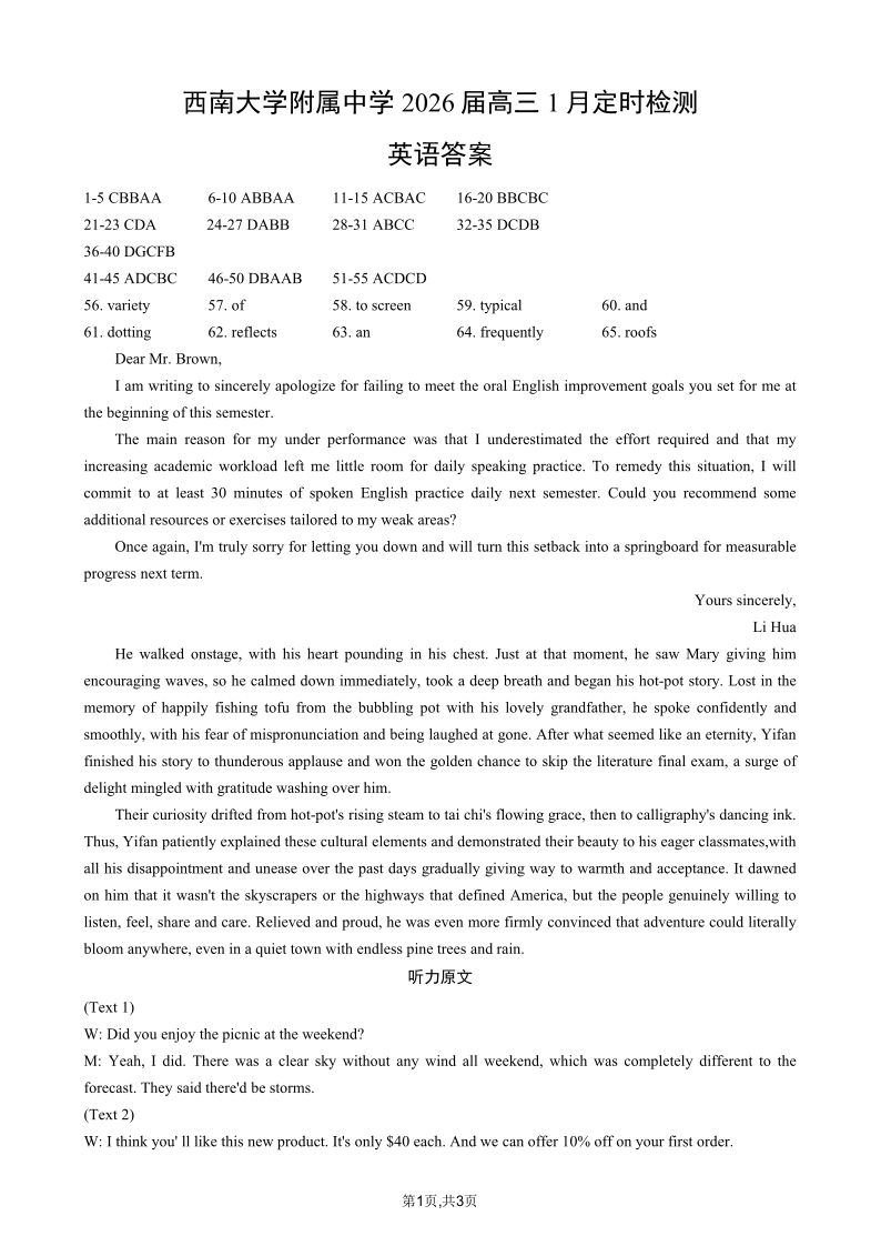 高三英语答案--重庆市西南大学附属中学2026届高三1月定时检测