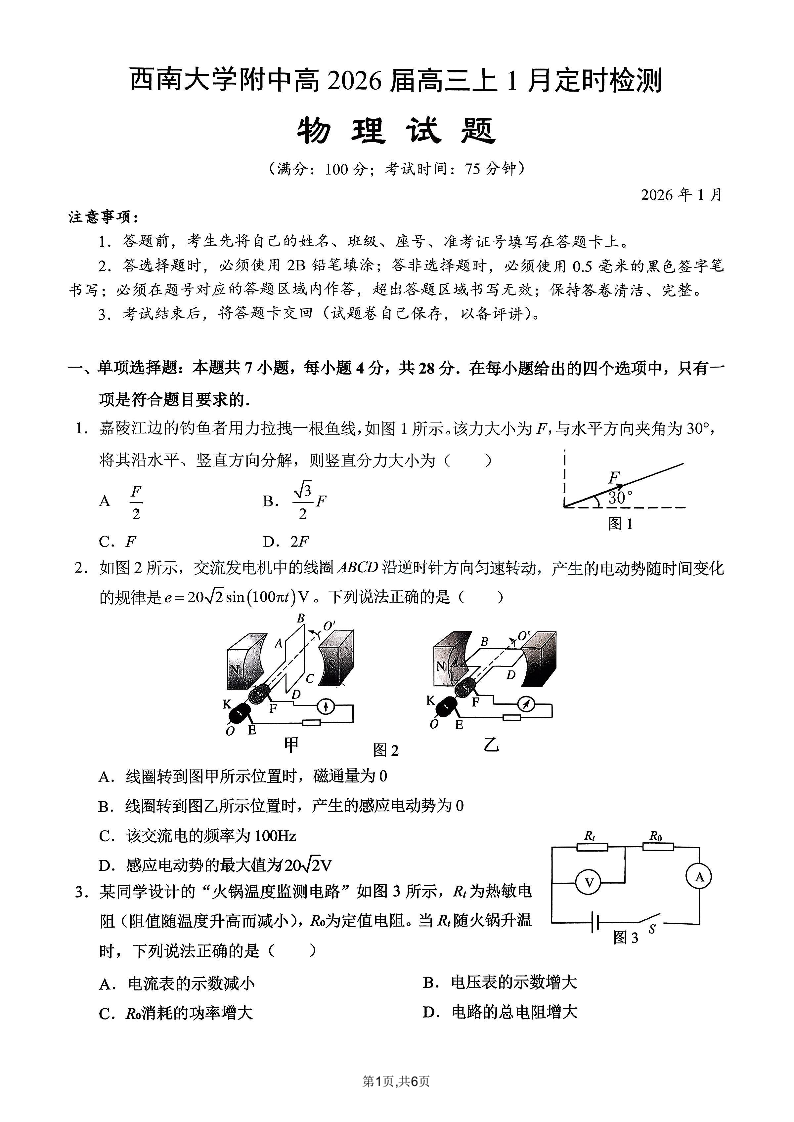 高三物理--重庆市西南大学附属中学2026届高三1月定时检测