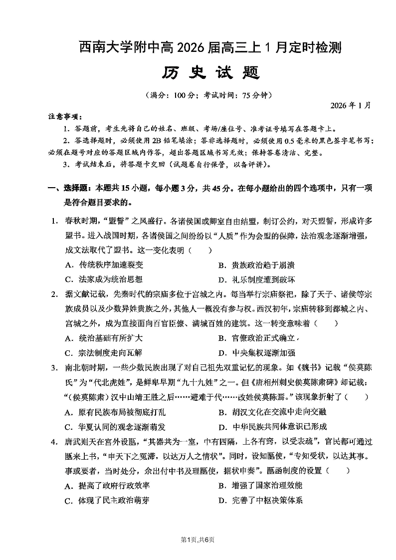 高三历史--重庆市西南大学附属中学2026届高三1月定时检测