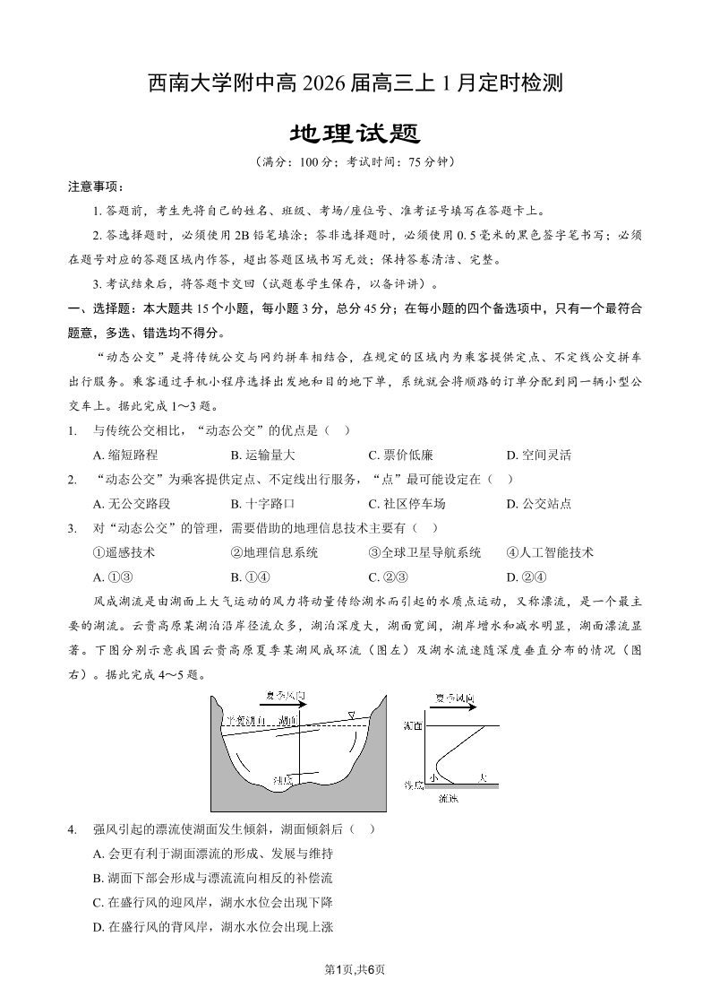 高三地理--重庆市西南大学附属中学2026届高三1月定时检测