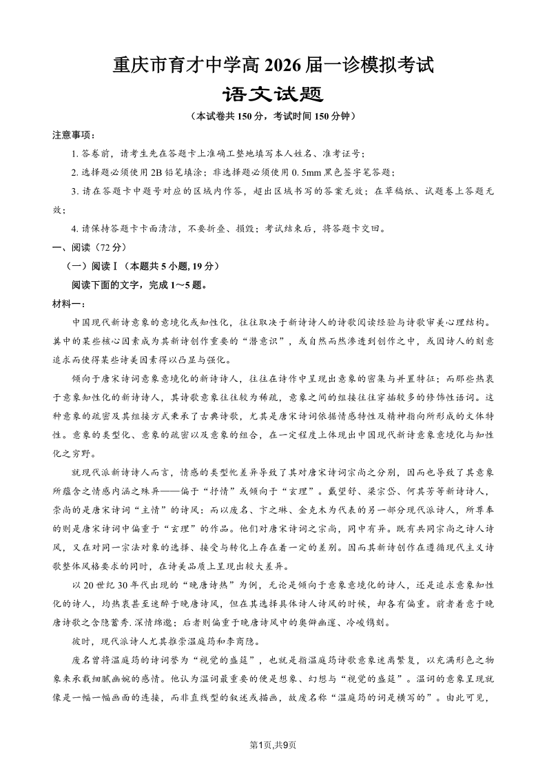 高三语文--重庆市育才中学2026届高三1月一诊模拟考试