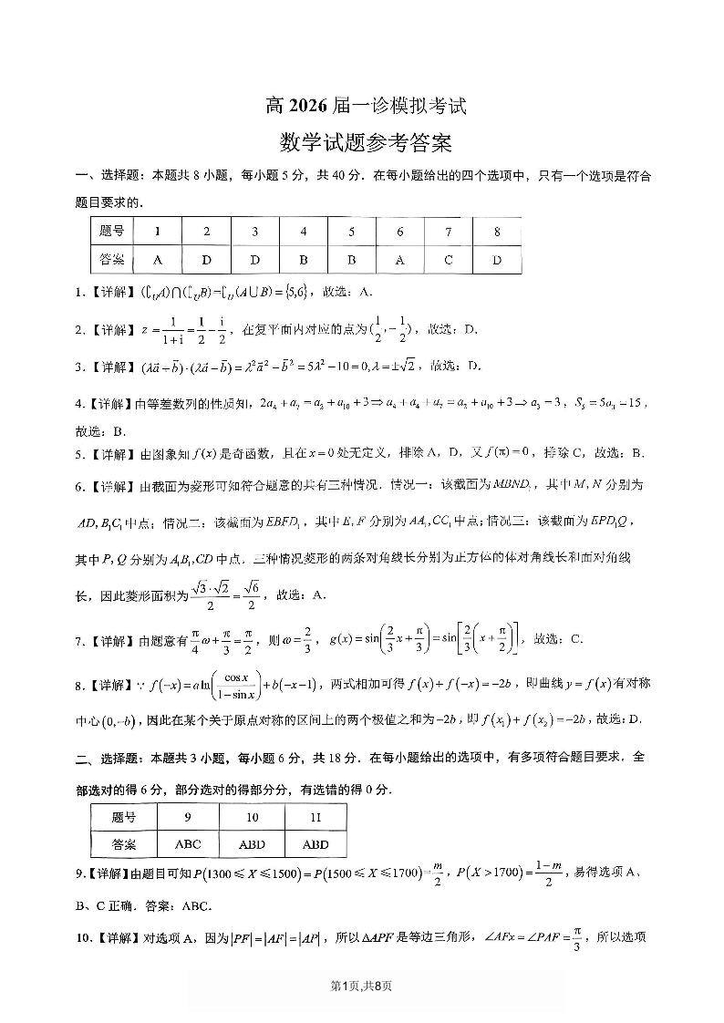 高三数学答案--重庆市育才中学2026届高三1月一诊模拟考试