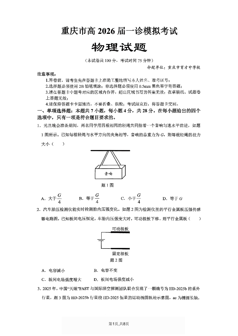 高三物理--重庆市育才中学2026届高三1月一诊模拟考试