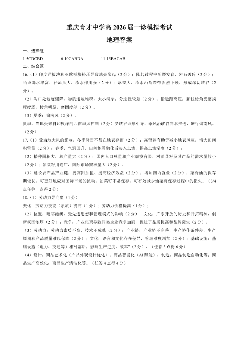高三地理答案--重庆市育才中学2026届高三1月一诊模拟考试