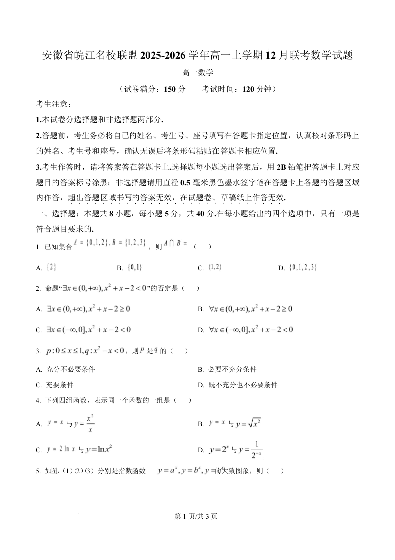 高一数学(原卷版)--安徽省皖江名校联盟2025-2026学年高一上学期12月联考