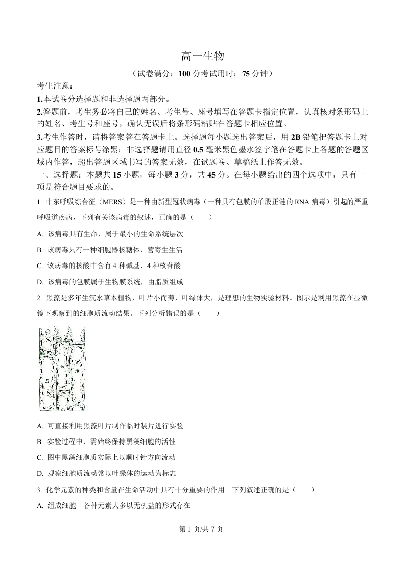 高一生物(原卷版)--安徽省皖江名校联盟2025-2026学年高一上学期12月联考