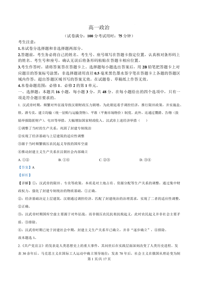 高一政治(解析版)--安徽省皖江名校联盟2025-2026学年高一上学期12月联考