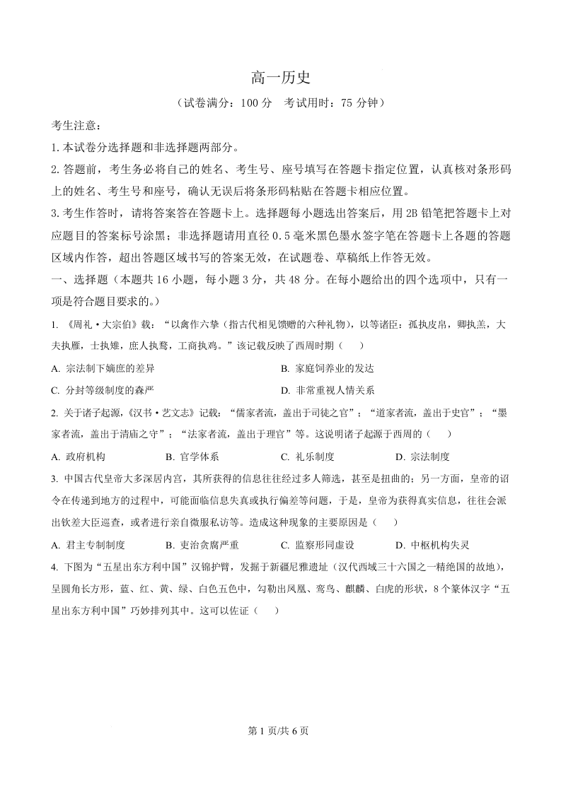 高一历史(原卷版)--安徽省皖江名校联盟2025-2026学年高一上学期12月联考