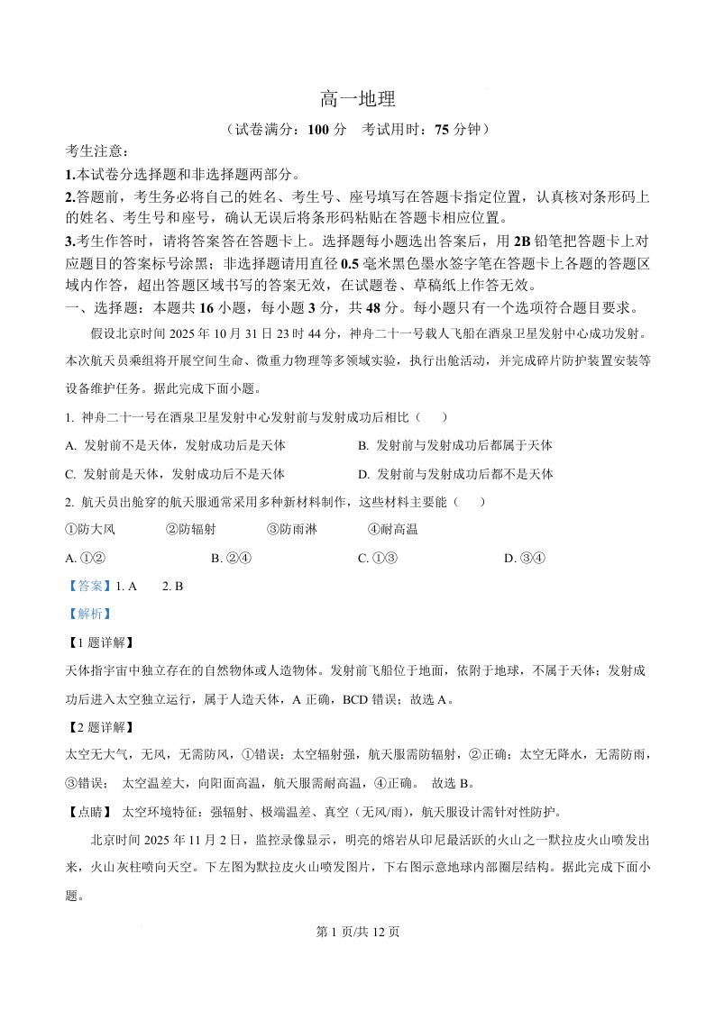 高一地理(解析版)--安徽省皖江名校联盟2025-2026学年高一上学期12月联考