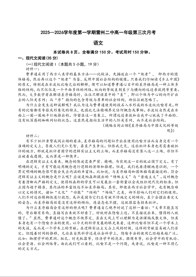 高一语文+答案--广东省湛江市雷州市第二中学2025-2026学年高一上学期12月第三次月考