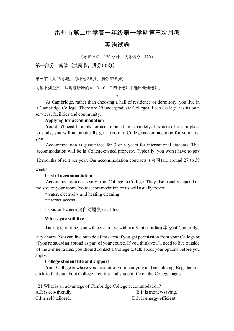 高一英语--广东省湛江市雷州市第二中学2025-2026学年高一上学期12月第三次月考