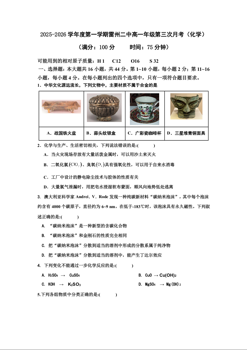 高一化学--广东省湛江市雷州市第二中学2025-2026学年高一上学期12月第三次月考