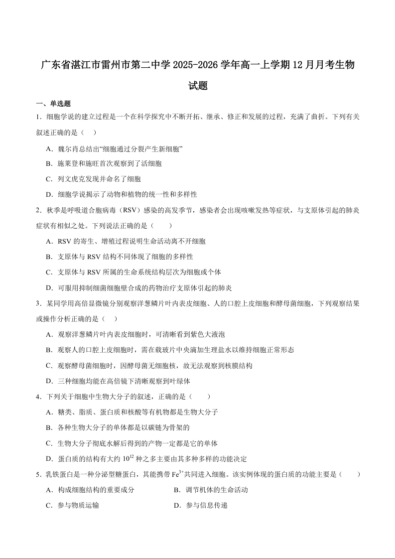 高一生物+答案--广东省湛江市雷州市第二中学2025-2026学年高一上学期12月第三次月考