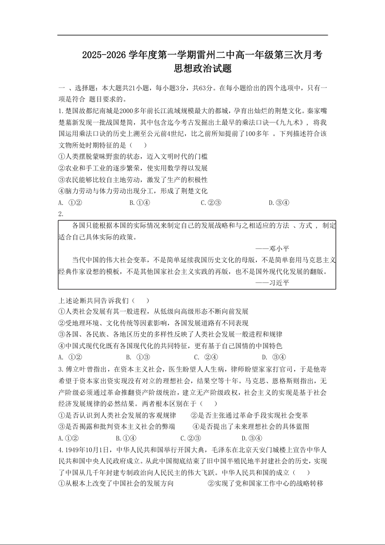 高一政治--广东省湛江市雷州市第二中学2025-2026学年高一上学期12月第三次月考