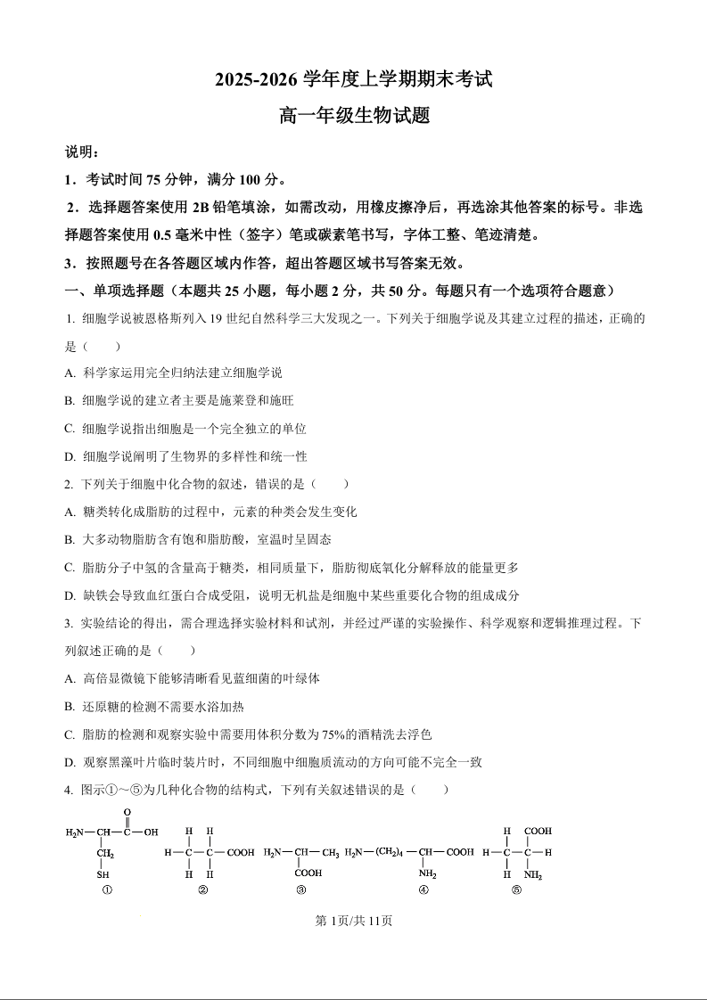 高一生物(原卷版)--黑龙江省大庆市大庆中学2025-2026学年高一上学期1月期末