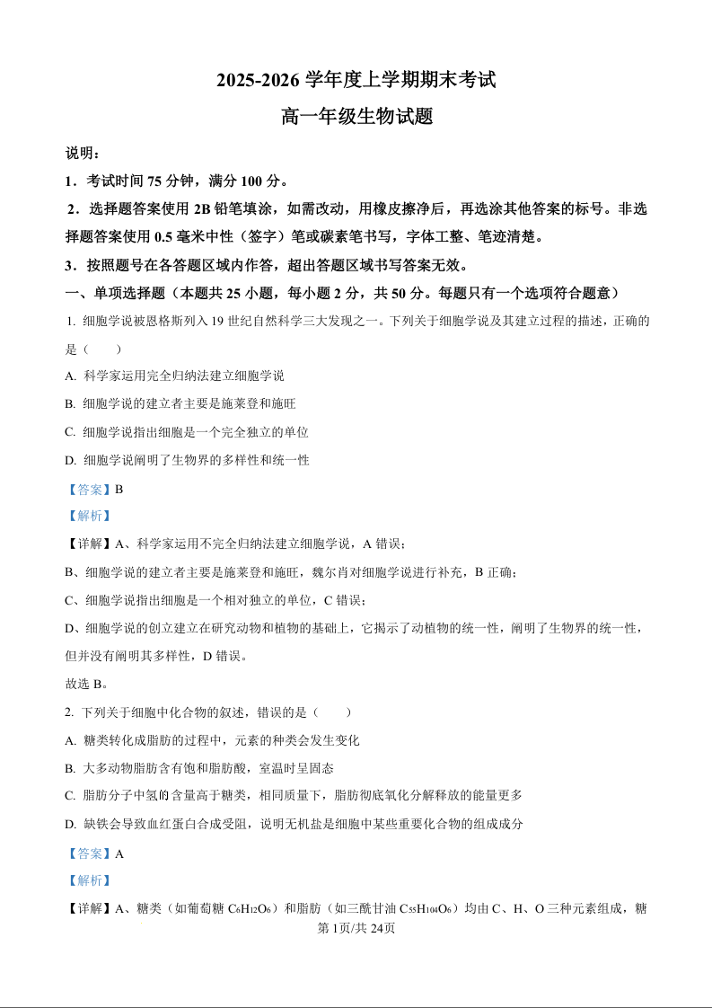高一生物(精品解析版)--黑龙江省大庆市大庆中学2025-2026学年高一上学期1月期末