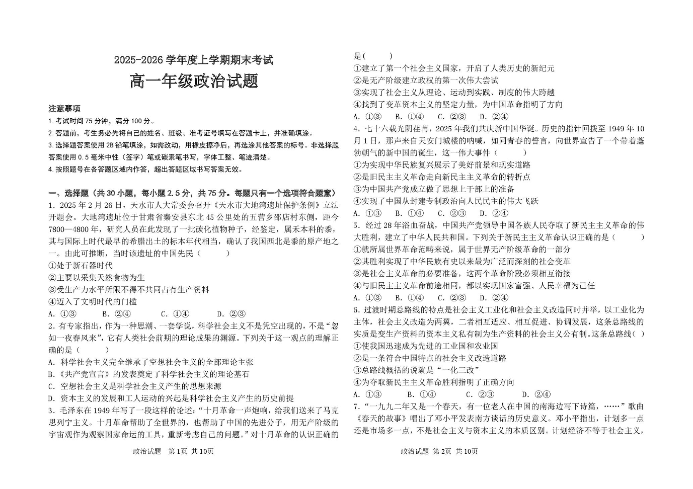高一政治--黑龙江省大庆市大庆中学2025-2026学年高一上学期1月期末